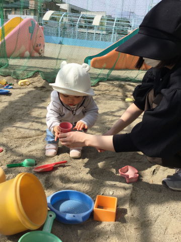 3月のすくすくルームでは、元気いっぱいすべり台・ブランコ・三輪車を楽しむお友達や、初めてのお砂場遊びで砂や砂場のおもちゃに興味津々のお友達の姿がみられました。