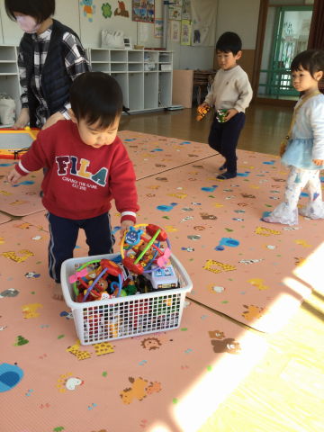 マラカスを見ると目をキラキラさせながら「わぁ~!!」と言ってかけ寄ってきて自分でマラカスを選んで取りました。